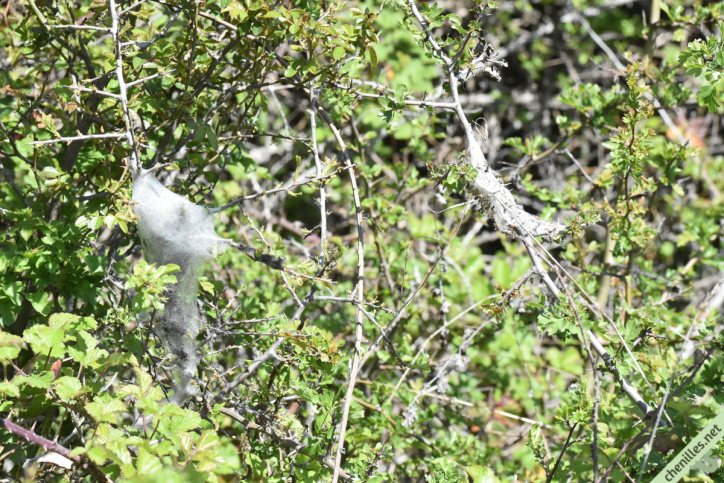 Published on 3 Mai 2022 in Rando-chenilles à Saint-Pons en ArdèchePleine résolution (1200 × 801) ← Précédent Suivant → Deux nids de Laineuses : à gauche, la Laineuse du cerisier (Eriogaster lanestris) ; à droite, la Laineuse du prunellier (Eriogaster catax). Remarquez les exuvies visibles à droite, et absentes à gauche.