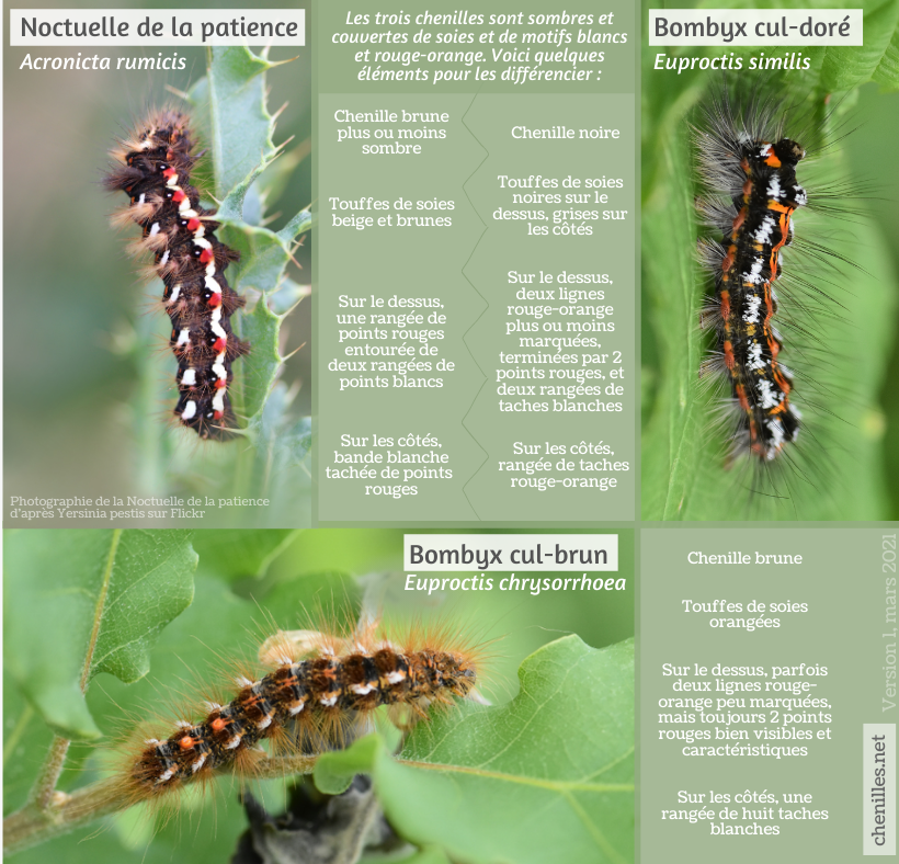 même genre, le Bombyx cul-doré (Euproctis similis) peut parfois, selon la coloration des individus, lui ressembler ; mais cette dernière est globalement plus sombre, possède en général deux fines lignes dorsales, et ses points rouges sont moins visibles. On peut également confondre la chenille du Bombyx cul-brun avec celle de la Noctuelle de la patience. Le visuel ci-contre peut vous aider à différencier ces trois espèces (cliquez pour l’afficher en grand).