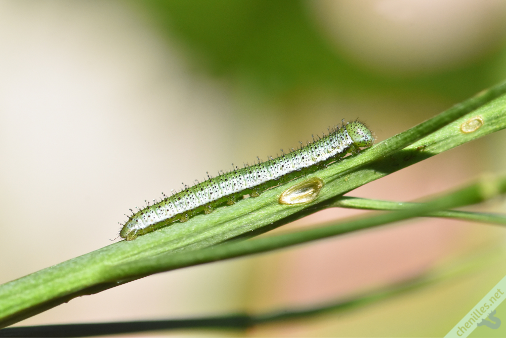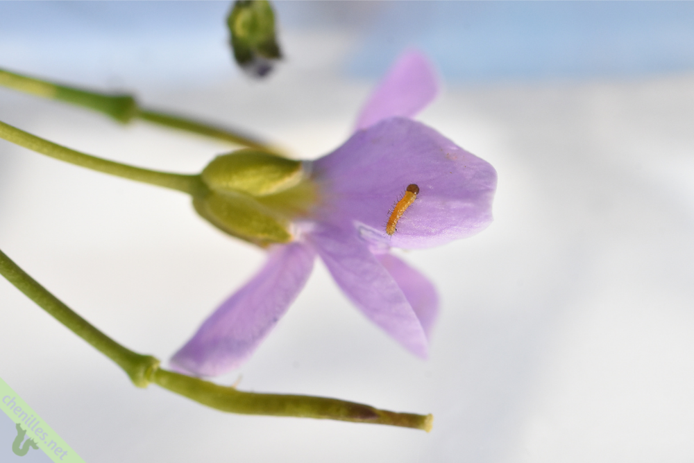 Au début du printemps, la Cardamine des prés (Cardamine pratensis) égaye nos pelouses de ses discrètes fleurs violettes. Elle fait partie des premières fleurs du printemps, s’épanouissant dès le mois de mars. C’est à la même période que l’Aurore (Anthocharis cardamines), un petit papillon blanc et orange de la famille des Piérides, émerge de sa torpeur nymphale. Après l’accouplement, la femelle se met à la recherche de plantes sur lesquelles pondre. Les chenilles de l’Aurore peuvent se nourrir de diverses Brassicacées, mais le plus souvent, c’est sur la Cardamine des prés ou sur l’Alliaire (Alliaria petiolata) que la femelle dépose ses œufs, à l’unité sur les boutons floraux. Les chenilles naissent généralement au début du mois d’avril, et commencent leur croissance en grignotant les pétales et les siliques de la plante.