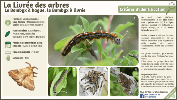 Les jeunes chenilles de la Livrée des arbres (Malacosoma neustria) ont une tête noire et brillante. On peut déjà les reconnaître à leurs bandes dorsales orangées et à leurs bandes latérales noires et blanches. À partir du 4ème stade larvaire, la tête de la chenille vire au bleu, et n’est plus brillante mais mate, avec de petits poils très courts. Au 5ème et dernier stade, une ligne dorsale blanche apparaît, et la chenille arbore une belle bande latérale bleutée.