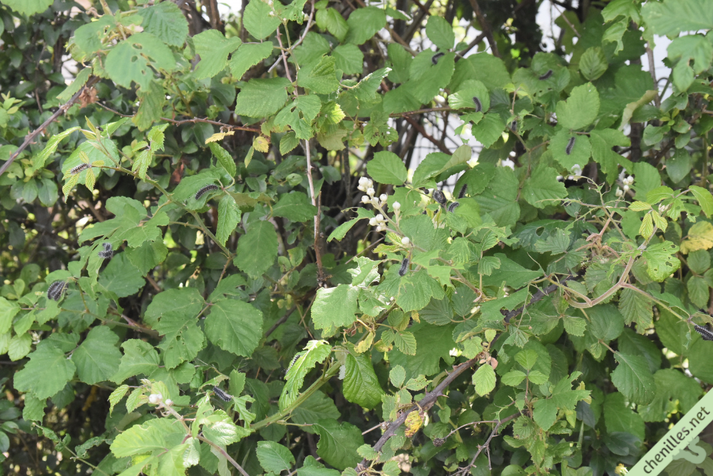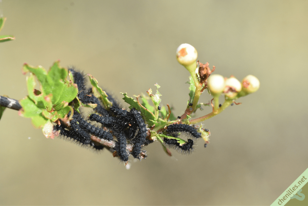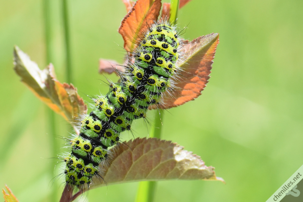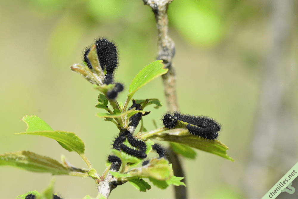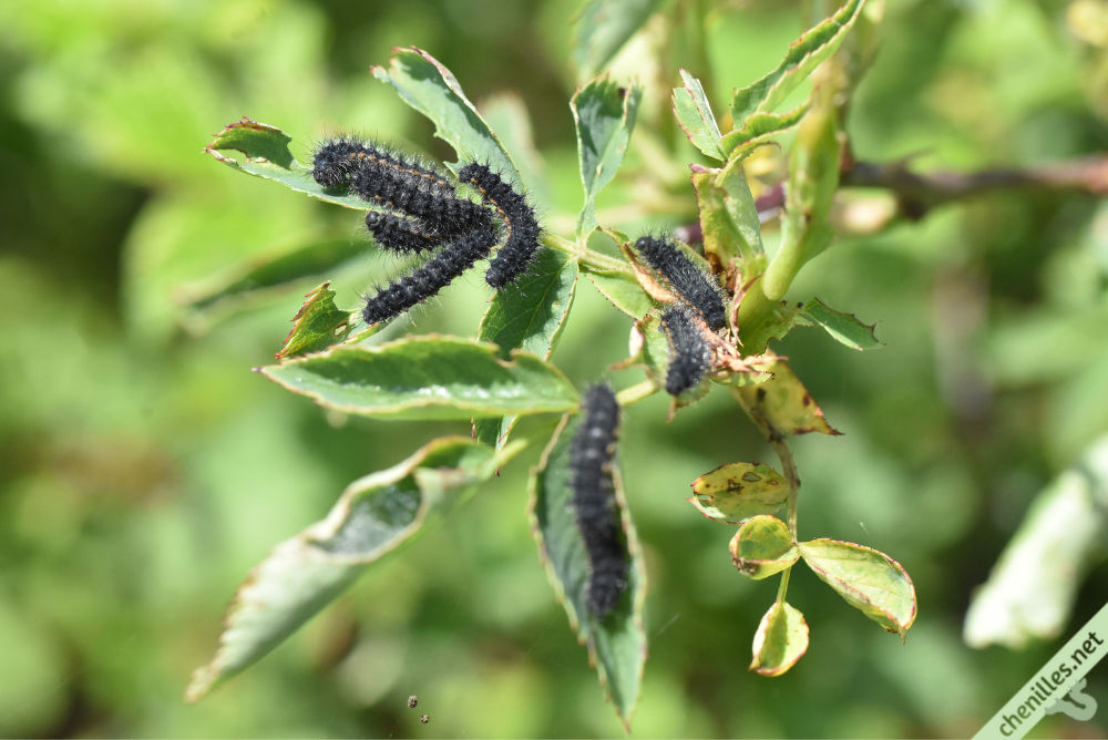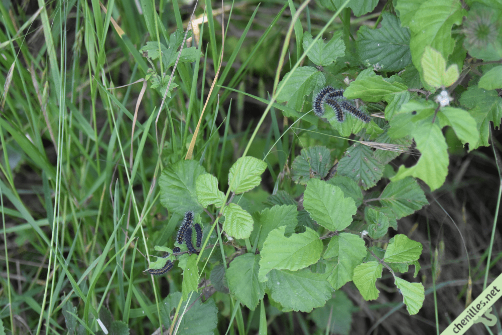 Si vous avez trouvé des chenilles de Petit paon de nuit dans votre jardin, pas de panique : elles sont parfaitement inoffensives (voir plus bas une photo des chenilles dans ma main). Durant les premiers stades, lorsqu’elles sont encore grégaires, elles peuvent former de petits groupes quelque peu impressionnants dans le feuillage de certains arbustes fruitiers comme les Framboisiers, mais il n’y a pas de raison de s’inquiéter : elles se dispersent rapidement, et les dégâts qu’elles peuvent causer sont minimes.