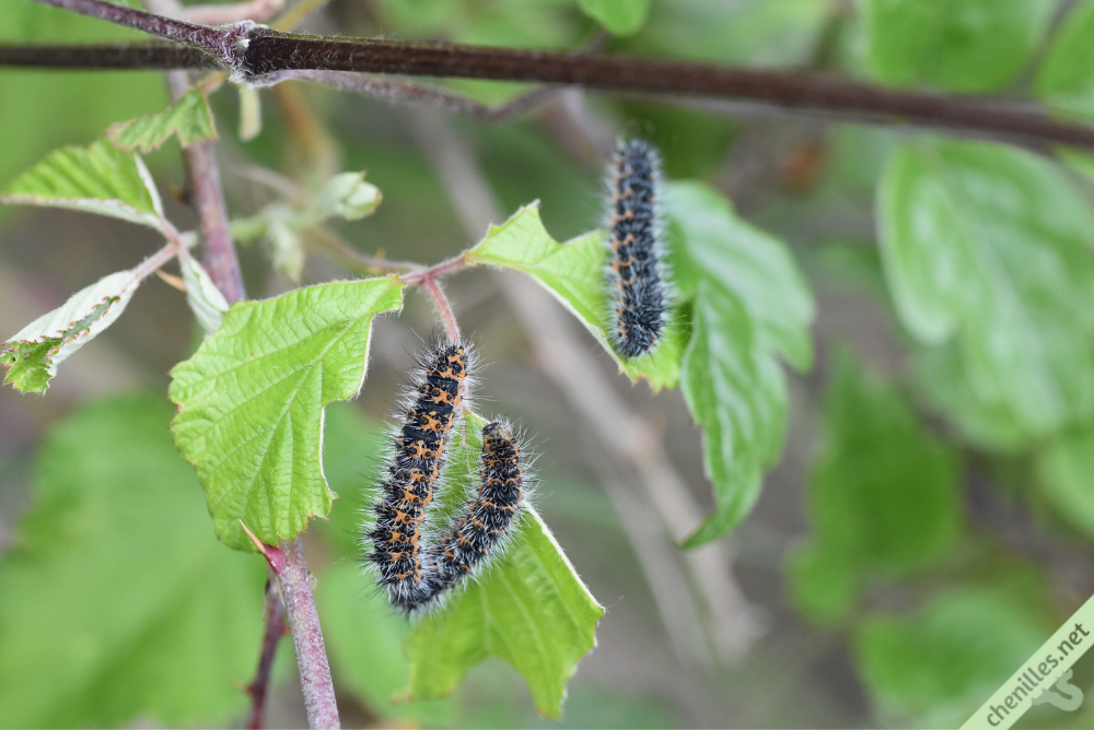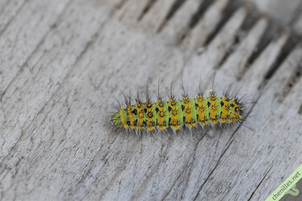 Les chenilles de cette espèce ont des couleurs assez variables, et changent beaucoup d’aspect au fil des différents stades larvaires. Au premier stade, elles sont entièrement noires avec plusieurs paires de petites protubérances de la même couleur alignées sur le dos, et couvertes de soies leur donnant un aspect hispide au toucher. Elles acquièrent une bande latérale rouge à partir du second stade. D’autres couleurs apparaissent à partir du troisième stade : certaines chenilles restent noires avec des taches rouges, d’autres vert-jaunâtre avec des taches noires… Mais on les reconnaît toujours à leurs verrues jaunes ou orange, desquelles partent des soies noires assez rêches. Au dernier stade, les chenilles sont vertes, avec ou sans anneaux noirs.